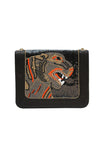 Angel Jackson's beautiful signature satchel now comes in pop inspired hand beaded panels with snakeskin and stitched leather trim to give a tough structured feel to update a classic style. Sophisticated gold hardware and chain strap with snakeskin shoulder patch finishes this bag for a darkly glamourous day to night look.
