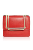 A chic and pared back leather version is available in a range of primary colours, featuring 1960s style gold frame across the flap, which also lifts to create a hand-held metal handle.